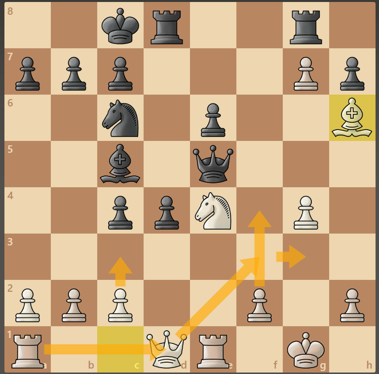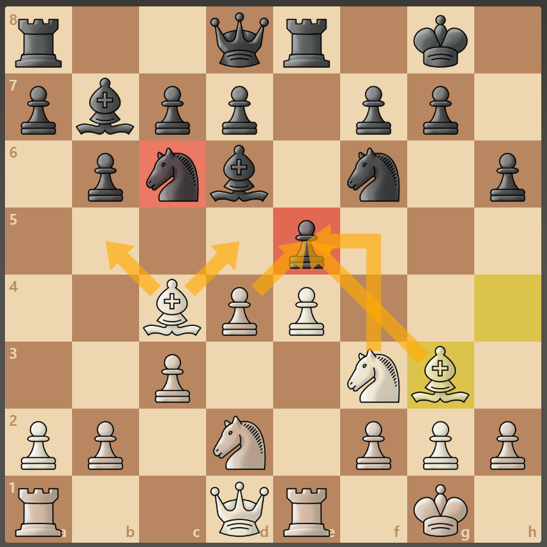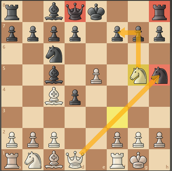 When black the move Kf8, white should be screaming in joy inside. White is going have a lot of fun here. White should start with the move 9. Bg5, threatening to play fxg7+ and winning the queen. So black has three options here— gxf6, g6 and any queen move.